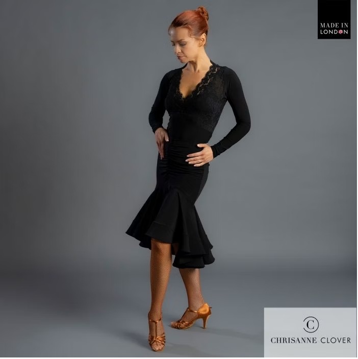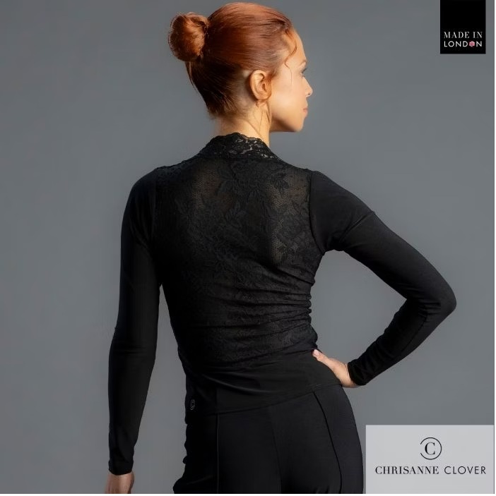 This eye-catching dance top showcases intricate stretch lace detailing layered over a soft stretch net lining, resulting in a delicate textural effect. The v neckline is beautifully framed with the scalloped stretch lace edging that extends gracefully to the back collar, hugging elegantly around the neck. The bust area and centre back are adorned with stretch lace, contrasting with the stretch crepe sleeves and top panel that lies beneath the lace, branded with a crystallized logo on the back left. This sophisticated top is designed to elevate your dance fashion and pairs perfectly with the Isabelle Ballroom Skirt, Freya Latin Skirt and Emanuela Trousers.