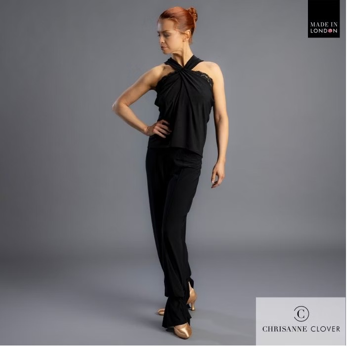 This elegant halter neck top showcases a beautiful design with stretch crepe gracefully layered over a stretch lace lining, allowing the delicate scalloped edges to peek through both above and below the crepe layer. The halter neck design features a crossover at the neckline that ties at the centre back, resulting in lovely ruching and draping. This top pairs beautifully with the Isabelle Ballroom Skirt, Freya Latin Skirt and Anya Trousers.