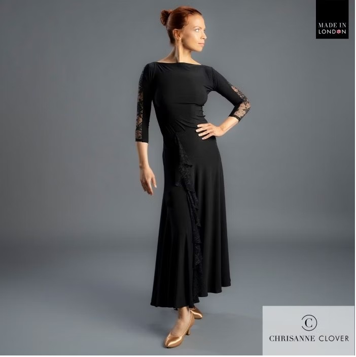 This beautiful, flared Ballroom skirt is made from stretch crepe and showcases a delicate stretch lace frill that gracefully embellishes both the front and back panels. Designed for the frills to be worn off centre, you can however have the flexibility to style it in various ways – allowing you the freedom to wear with the frill at the centre front and back or worn with the lace frill cascading down at the side seams or positioned off centre. It pairs beautifully with the Constance top, Elizabeth top and Hariet top for a cohesive lace ensemble.