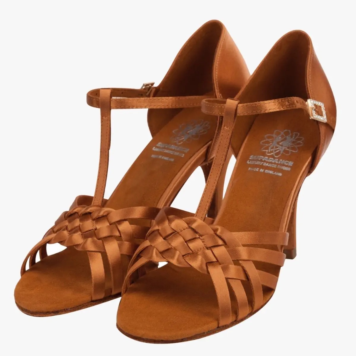 High-performance Latin shoe featuring a plaited vamp for enhanced flexibility and a secure T-bar strap for superior support and stability during movement.