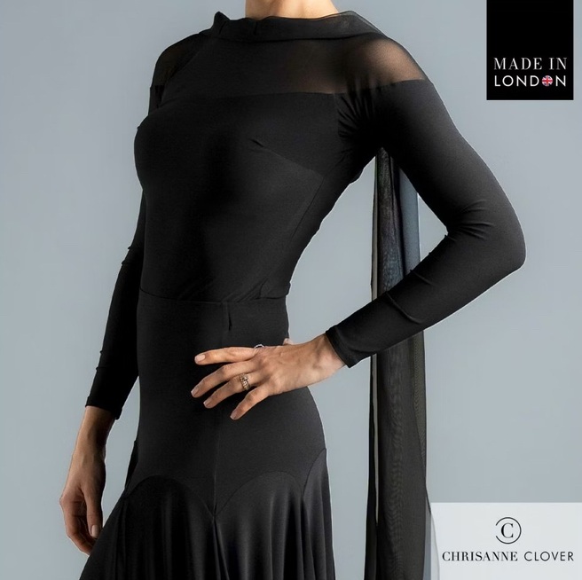 The design combines a stretch net top piece that drops below the shoulder with a contrasting stretch crepe bodice and sleeves for a sophisticated layered look. A large diamond-shaped keyhole back fastens with a single covered button and is embellished with a branded logo motif for a luxurious finish. Perfectly paired with the Oakley Ballroom Skirt, Cressida Ballroom Skirt, Payton Trousers, or Emanuela Trousers for versatile styling.